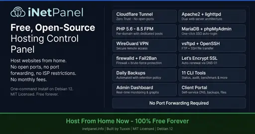 arrow-up114arrow-down1image[Promoting] Host Your Own Websites from Home — Free Control Panel for Debian 12 — iNetPanelplus-squarelemmy.mlTuxxin2@lemmy.mlEnglish · 2 days agomessage-square3linkfedilink