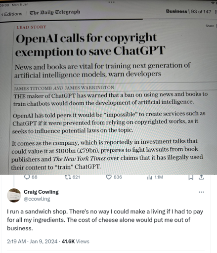 And stop comparing AI to humans but then giving AI models more freedom. If I wrote a paper I’d need to cite my sources. Where the fuck are your sources ChatGPT? Oh right, we’re not allowed to see that but you can take whatever you want from us. Sounds fair.