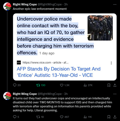 The only person at the senate inquiry into this that had any balls was Greens Senator David Shoebridge. Got his mic cut off for politely telling a cop to basically go fuck himself.