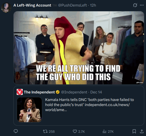 minus-squaregoferking (he/him)@lemmy.sdf.orglinkfedilinkarrow-up2·1 month agoWild how dems supporters refuse to accept it