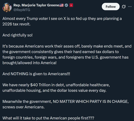 arrow-up197arrow-down1imageMTG calls upon right wingers to stop paying taxeslemmy.mlgeneva_convenience@lemmy.ml to Progressive Politics@lemmy.world · 2 months agomessage-square19linkfedilinkfile-text