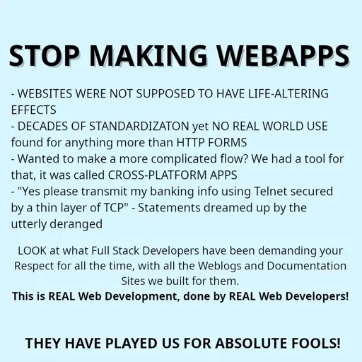 somerandomperson@lemmy.dbzer0.com to Programmer Humor@lemmy.ml · 13 days agoelectron.jxllemmy.mlimagemessage-square10linkfedilinkarrow-up1136arrow-down115