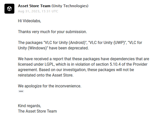 Everyone can agree on VLC being the best video player, right? Game developers can agree on it too, since it is a great utility for playing multimedia in games, and/or have a video player included. However, disaster struck; Unity has now banned VLC from the Unity Store, seemingly due to it being under the LGPL license which is a “Violation of section 5.10.4 of the Provider agreement.” This is a contridiction however. According to Martin Finkel in the linked article, “Unity itself, both the Editor and the runtime (which means your shipped game) is already using LGPL dependencies! Unity is built on libraries such as Lame, libiconv, libwebsockets and websockify.js (at least).” Unity is swiftly coming to it’s demise.
