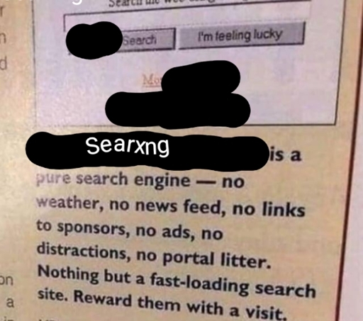 I love searxng, but it still feels like using a deadly gun, but with gloves, so I don’t touch it directly to be able to say “I don’t use guns” 😁